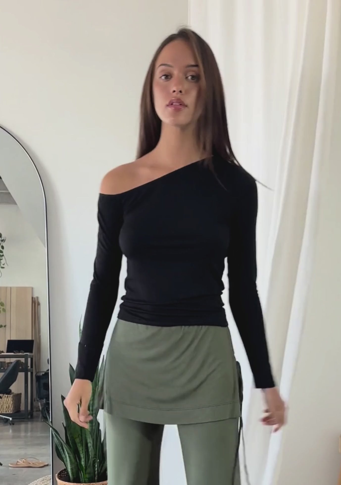 A modern twist on an everyday essential. The Aria Top features an asymmetrical neckline, delicate shoulder pleat, and subtle bell sleeves for effortless style. Perfect for layering, lounging, or dressing up for a night out.