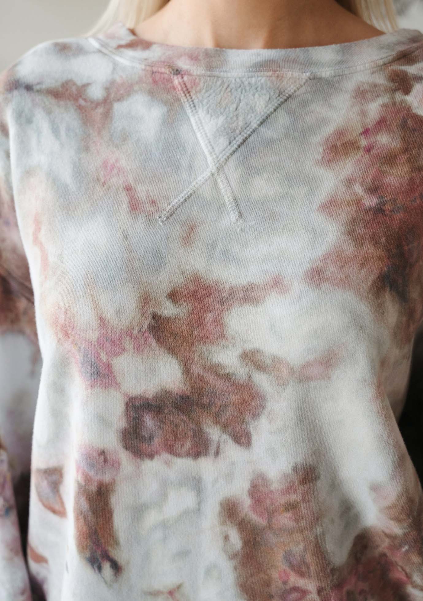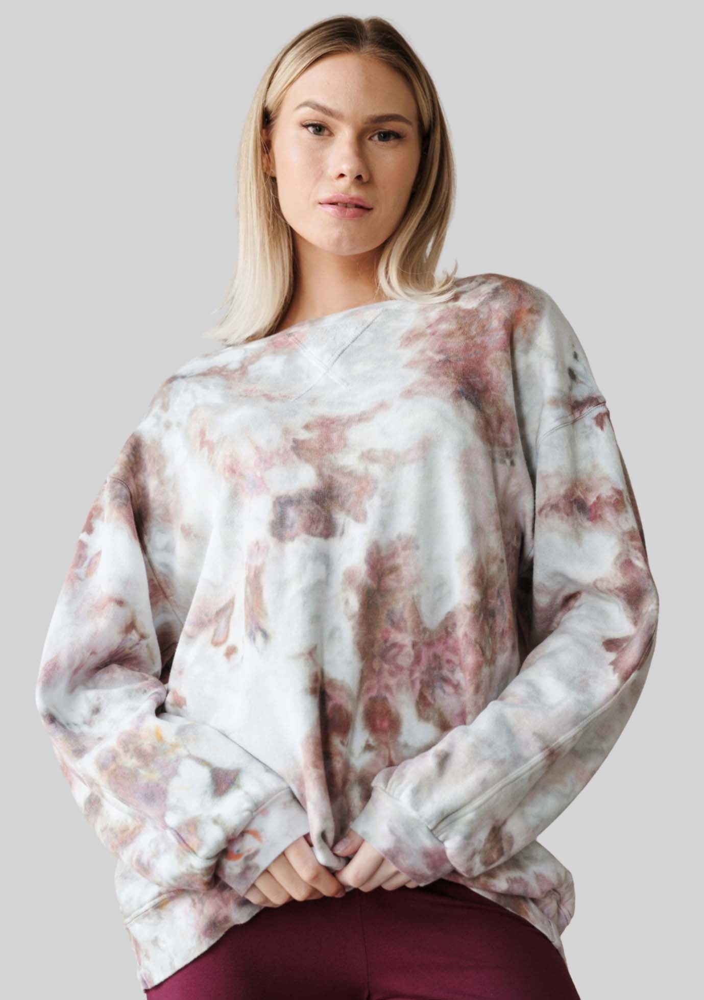 Sustainable, natural, ultra soft, sherpa french terry. 50% Cotton, 50% Modal. Each piece is hand dyed and may vary in color and placement.