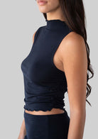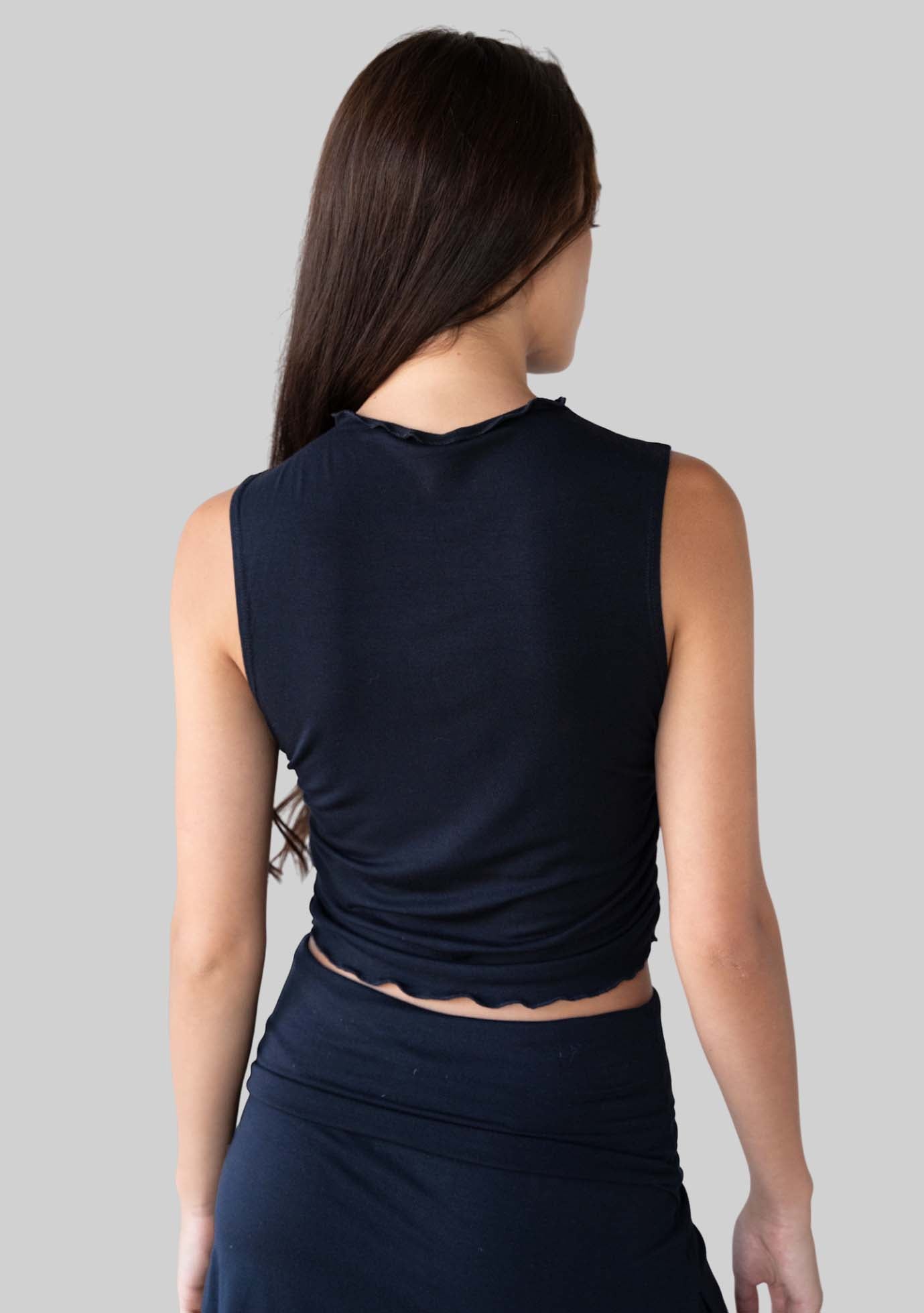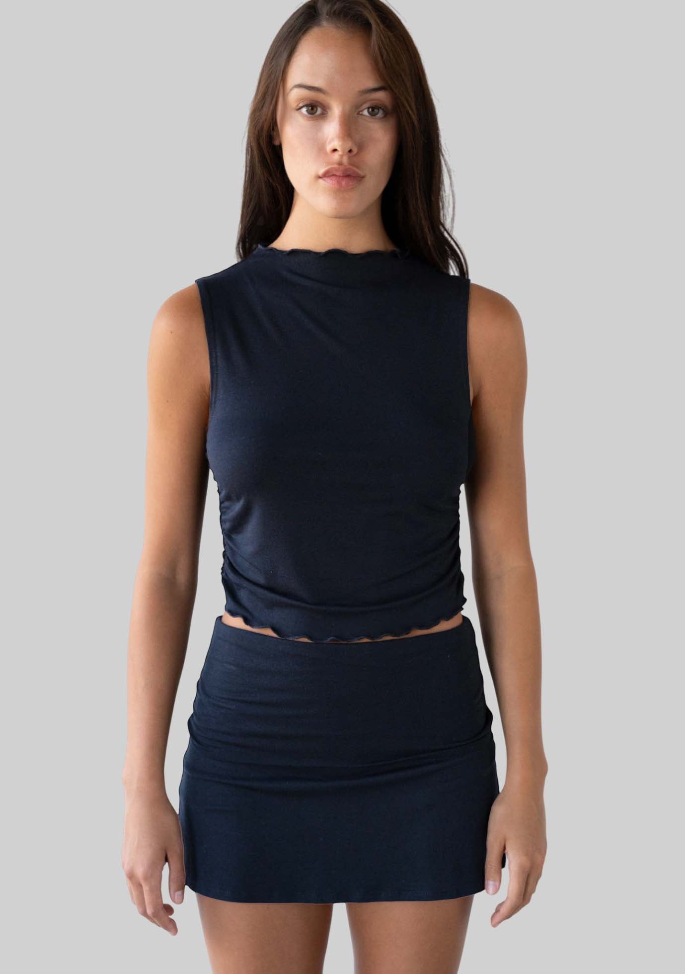 A soft and flattering tank featuring a delicate lettuce-edge hem, side shirring, and high neckline. Pairs effortlessly with yoga pants, skorts, or your favorite jeans.
